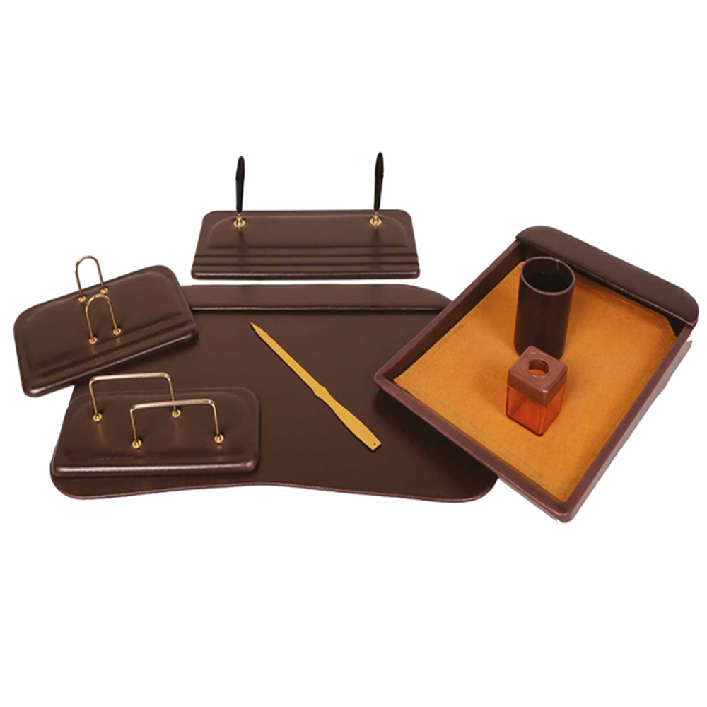 ست لوازم اداری رومیزی چرمی8 تیکه در 3 رنگ مشکی و قهوهای و ونگه شامل: زیردستی، کاذیه، جا قلمی، جا سنجاق، پایه خودکار، پایه تقویم، جا پاکت نامه، پاکت باز کن