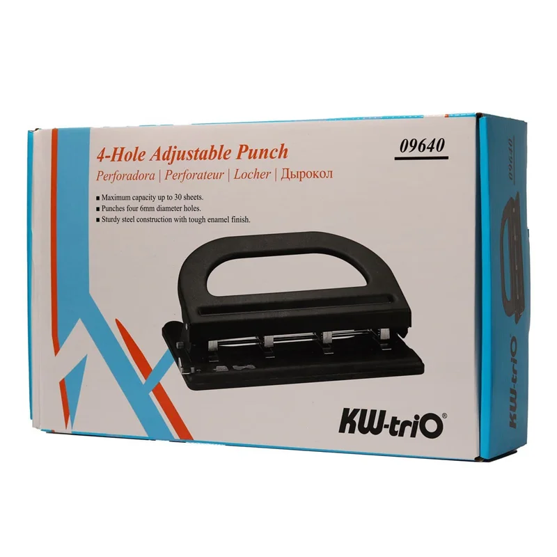 دستگاه پانچ کی دبلیو تریو KW-Trio مدل 4 سوراخه 9640 پانچ 4 سوراخ KW-triO 9640 4-Hole Adjustable Punch با ظرفیت پانچ 30 ورق دستگاهی کاربردی برای استفاده روزمره در ادارات، مدارس، سازمان ها و… می باشد. دستگاه پانچ کی دبلیو تریو مدل 9640 مناسب برای سوراخ کردن کاغذ و اسناد مهم برای قرار دادن آنها در زونکن، کلاسور و ...